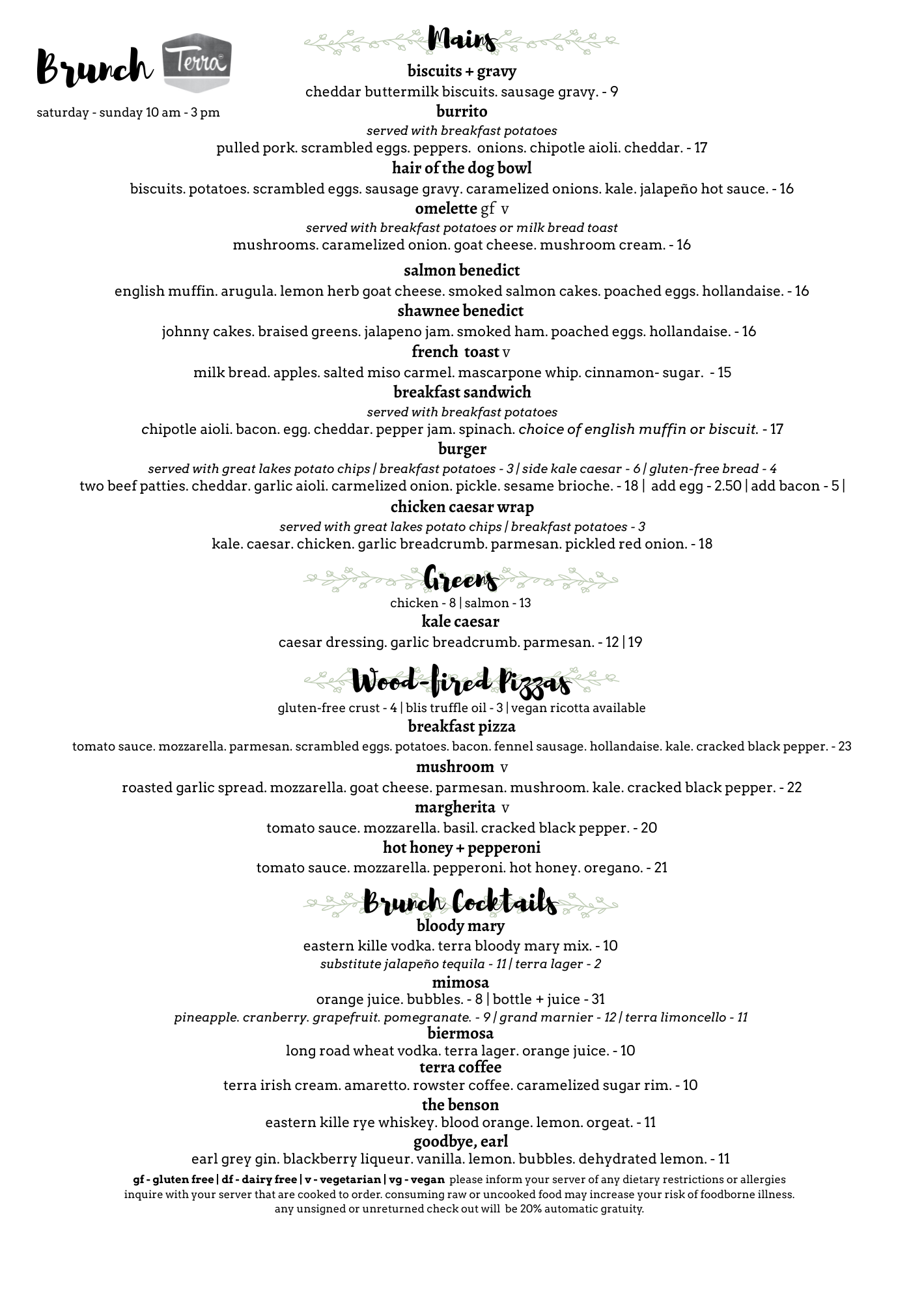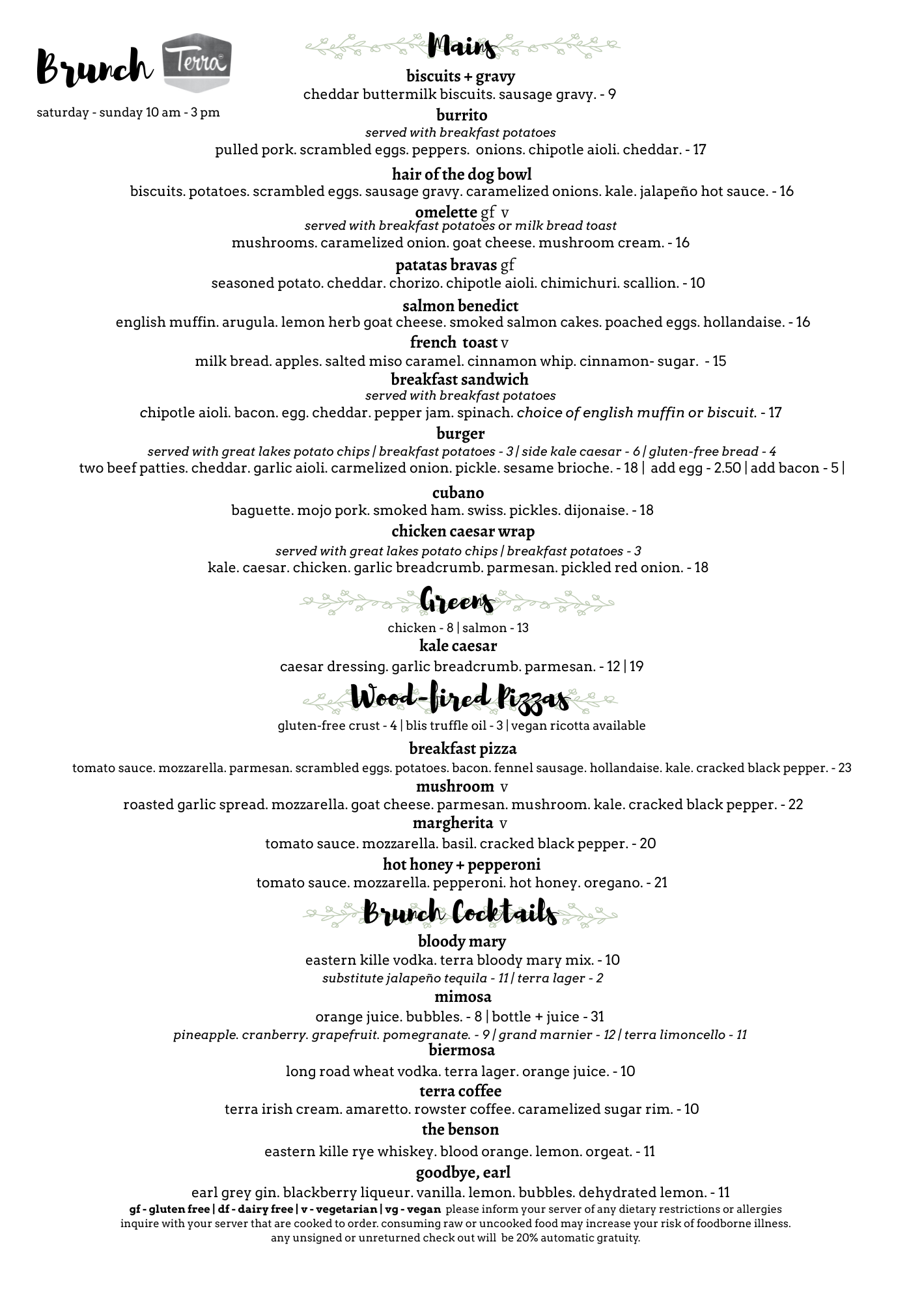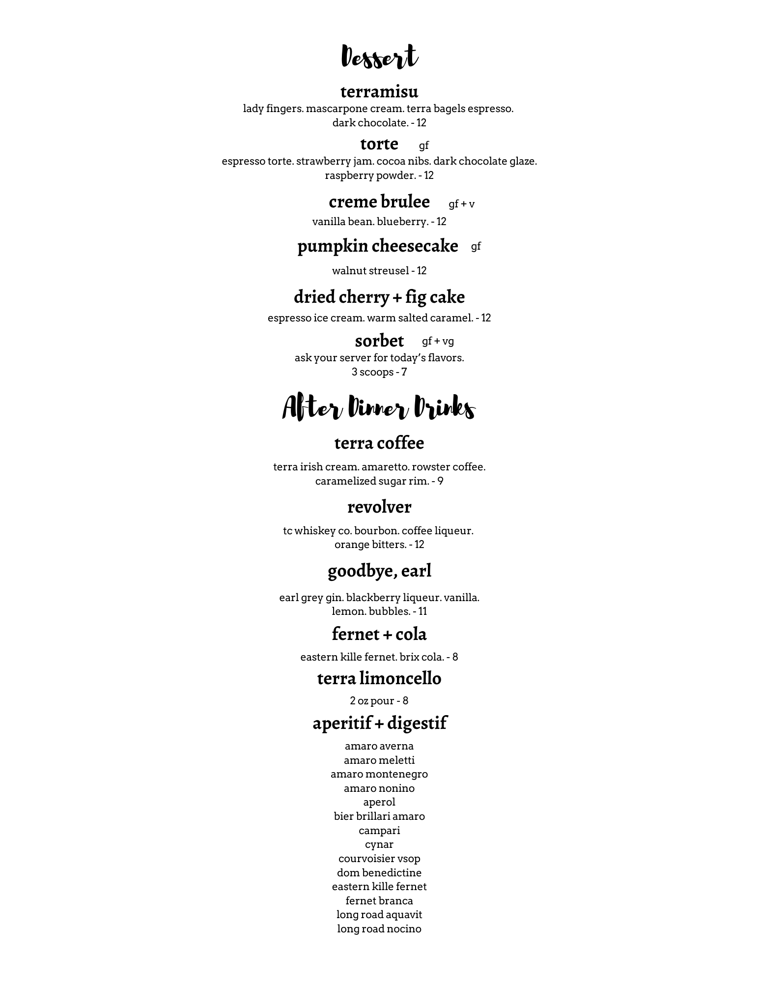 At Terra, we bring authenticity to the table through thoughtful sourcing of seasonal, sustainable ingredients from our local farms & purveyors. We believe in a culture driven by community & take pride in providing genuine hospitality. Through this, we offer passion-driven, hand-crafted experiences from farm to our table.